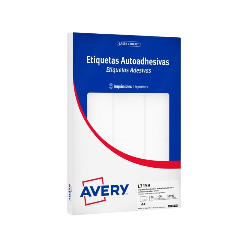 ¡Etiquetas tamaño estándar de Avery para el formato A4! Este pack trae 100 hojas tamaño A4, con 24 etiquetas blancas por hoja. Cada etiqueta mide 64x34mm, un formato ideal para códigos de producto o sobres. Son autoadhesivas y multifunción, compatibles con Láser e InkJet. ¡Podés imprimir grandes volúmenes de etiquetas de identificación con la calidad profesional de Avery!