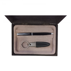 Elegante set de regalo compuesto por un bolígrafo Micro VIP modelo Rivero y un llavero a juego. Presentado en una distinguida caja de madera, ideal para obsequios corporativos o personales. El bolígrafo tiene tinta azul, trazo medio y un acabado exterior negro sofisticado. Incluye estuche para mayor presentación y protección.