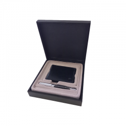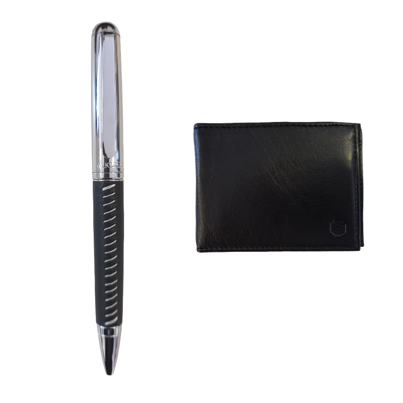 El Set Micro Bolígrafo Pampa + Billetera combina elegancia y funcionalidad en un solo regalo. Incluye un bolígrafo de diseño sofisticado con escritura suave y precisa. La billetera de simil cuero negro, compacta y moderna, ofrece múltiples compartimentos para una organización impecable. Un set perfecto para quienes valoran la calidad y el estilo.