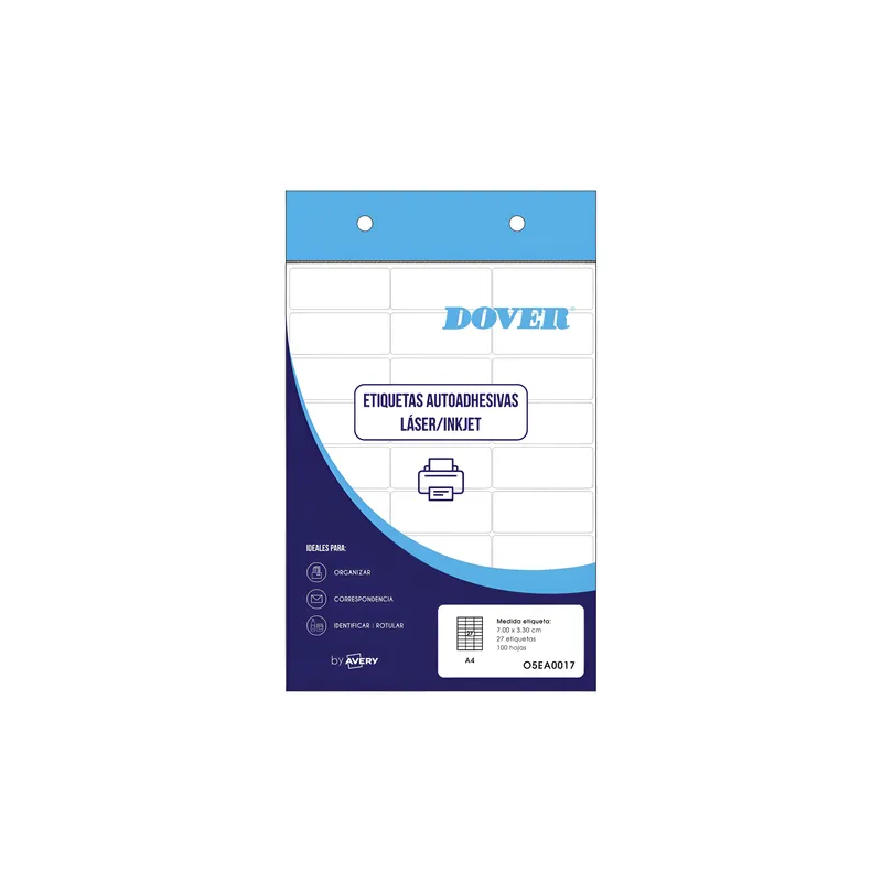 ¡El clásico formato de etiquetas para múltiples tareas! Este pack de Dover trae 100 hojas tamaño A4, con 27 etiquetas blancas por hoja. Cada etiqueta mide 7x3.30cm, un tamaño muy versátil para correspondencia e identificación. Son autoadhesivas y multifunción, compatibles con Láser e InkJet. ¡Podés imprimir una gran cantidad de etiquetas estándar para organizar todo tu trabajo!