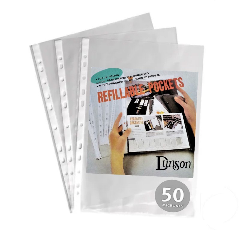 Excelentes folios dunson de calidad premium (50 micrones). Posee banda blanca lateral con múltiples perforaciones para facilitar el guardado en cualquier tipo de carpeta.