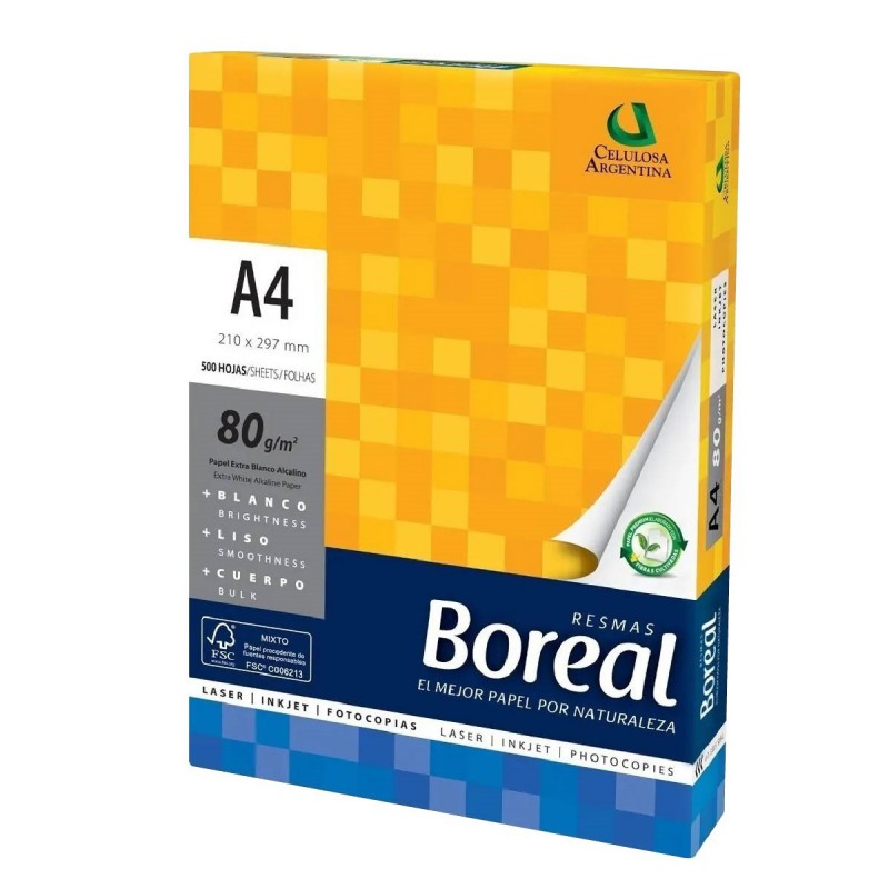 La resma Boreal tamaño A4 color extra blanco es la opción ideal para impresiones nítidas y de calidad. Con un gramaje de 80gr y 500 hojas por resma, este papel de tipo obra garantiza un contraste perfecto para tus textos e imágenes.