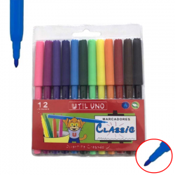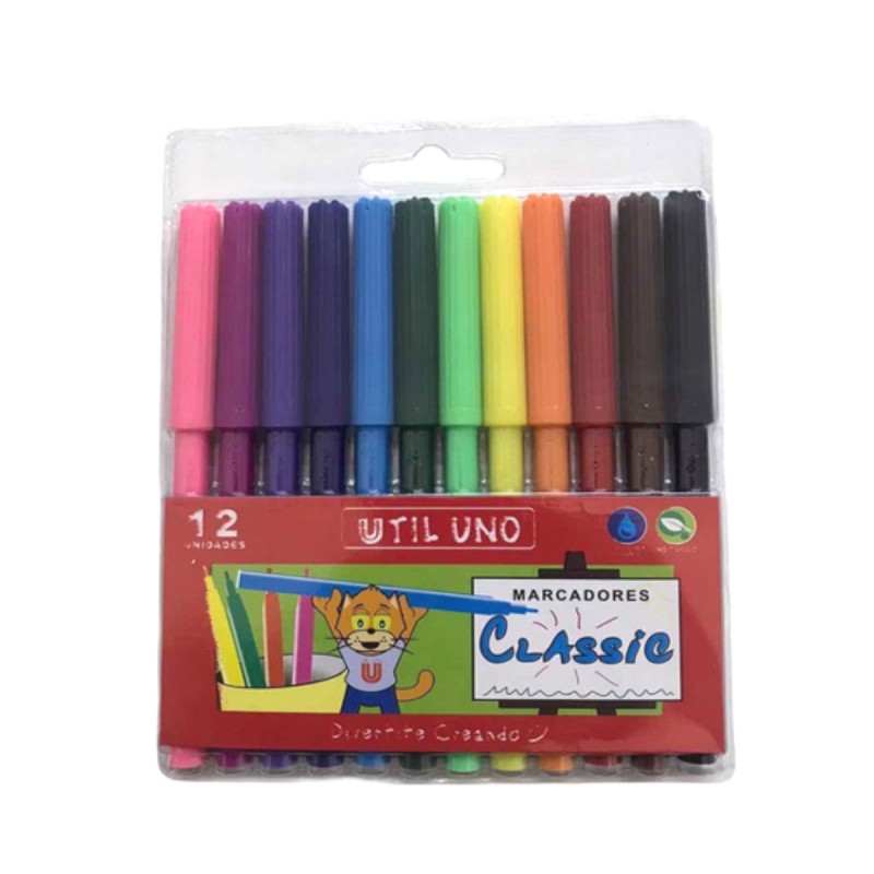 El Marcador Escolar Utiun Classic X12 viene en una caja que contiene 12 unidades de marcadores con punta redonda. Su tinta al agua es perfecta para usar sobre papel, garantizando trazos claros y nítidos. El cuerpo de los marcadores está fabricado en plástico resistente, lo que los hace duraderos y cómodos de usar.